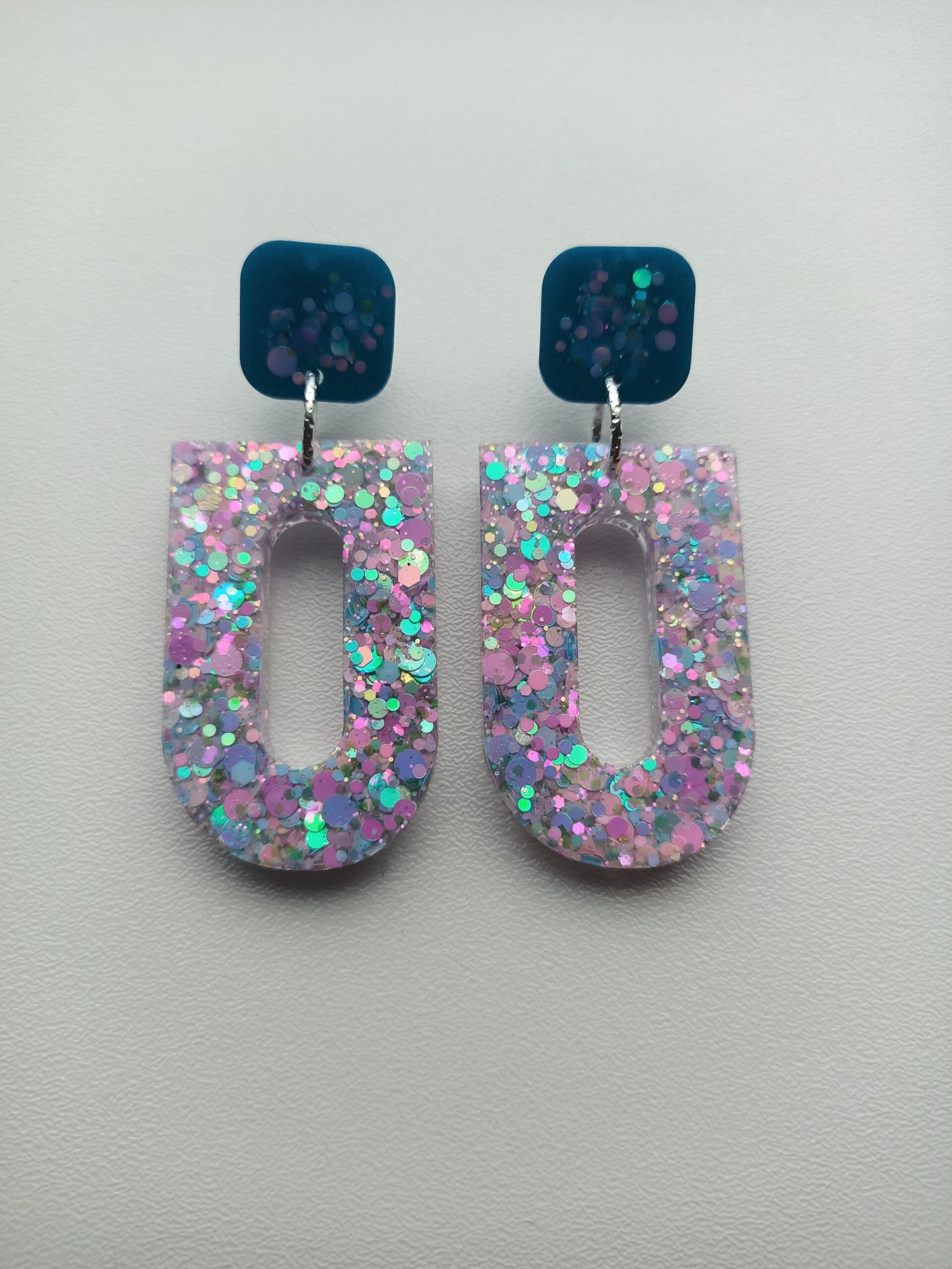Speciaal gemixt pigment afgewerkt met hoog kwaliteit glitters van Glitter Queen (my little pony) afgewerkt met RVS zilveren oorstekers en ringetjes