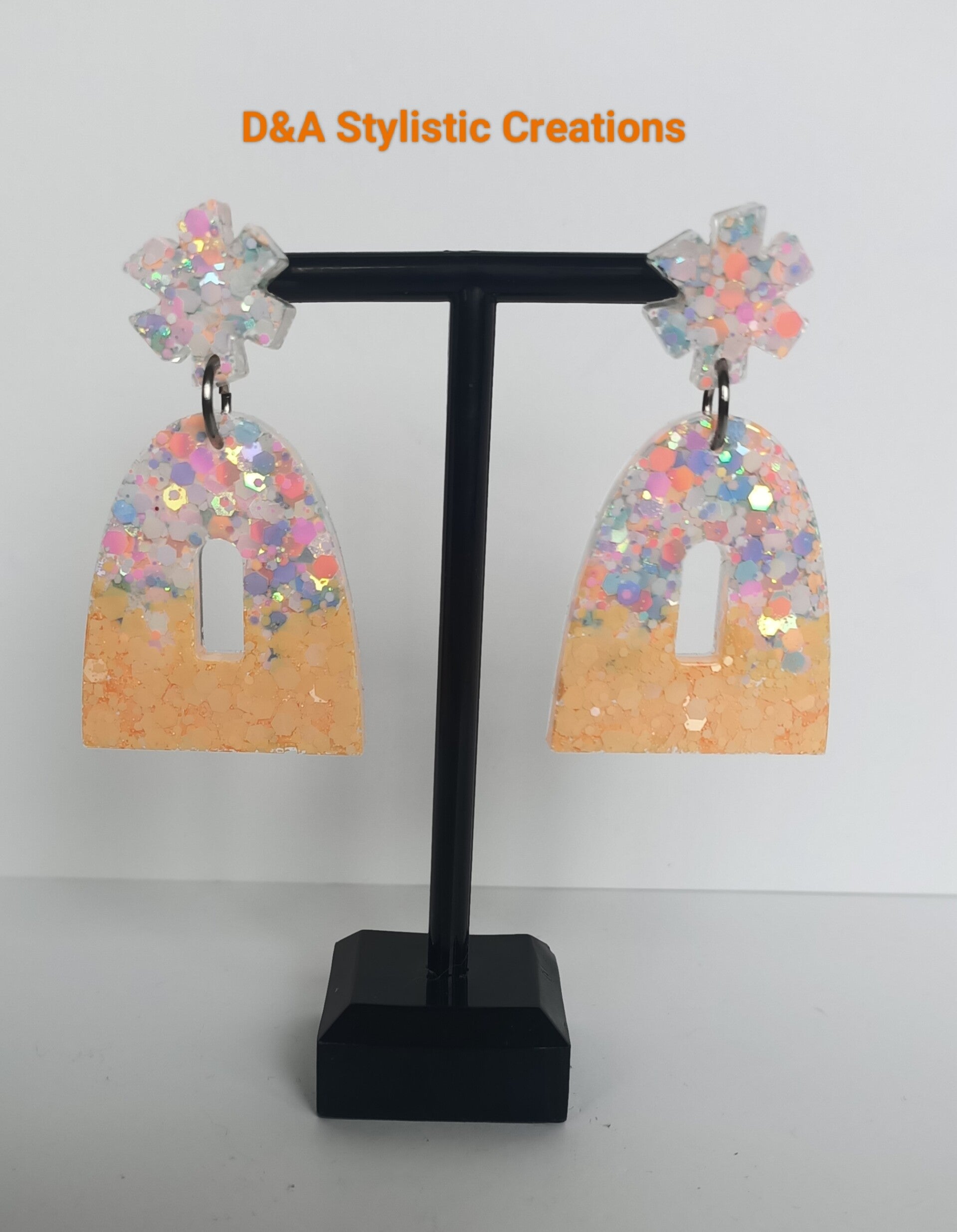 Prachtige oorbellen gemaakt van epoxy en hoog kwaliteit glitters van Glitter Queen (pastel oranje). Afgewerkt met RVS metalen onderdelen.