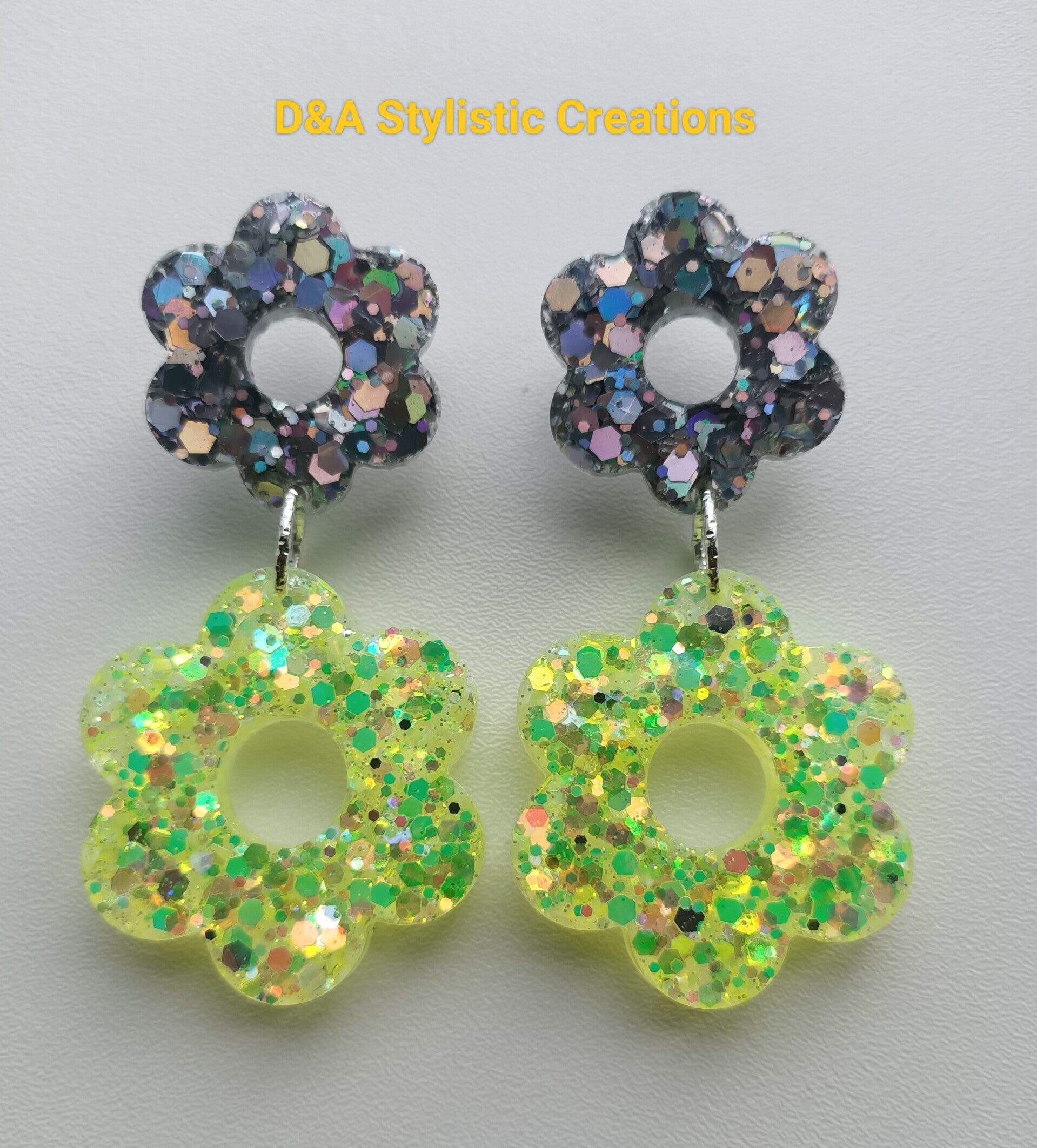 Prachtige oorbellen gemaakt van epoxy en hoog kwaliteit glitters van Glitter Queen (holo en Neon collectie). Afgewerkt met RVS metalen onderdelen.