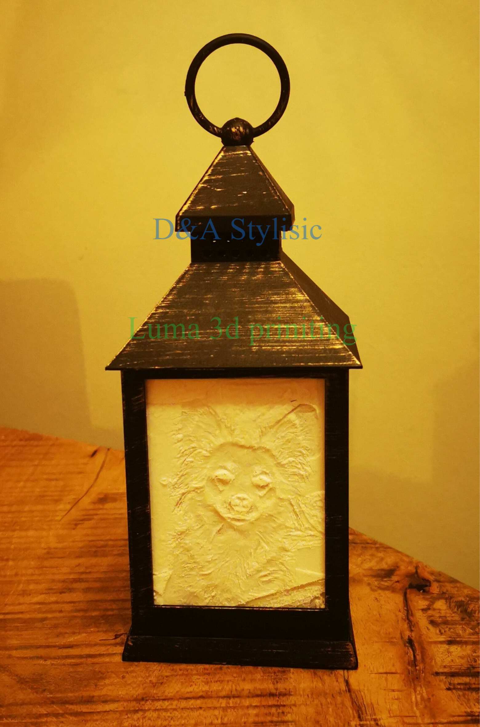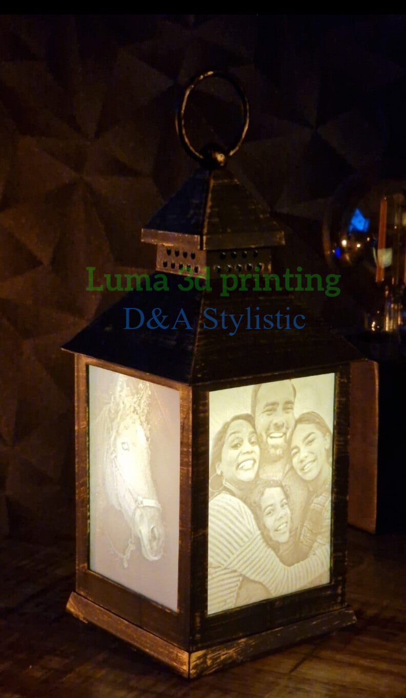 Een lantaarn in het zwart of wit met 4 lithofaan foto's. In de lantaarn zit verlichting zodat je s'avonds echt de foto's tot leven ziet komen. De verlichting flikkert subtiel als een kaars voor een gezellige sfeer, in de lantaarn zit ook een timer functie zodat deze 8 uur lang aanstaat en vanzelf 16 uur uitblijft zodat deze alleen in de avond aangaat.