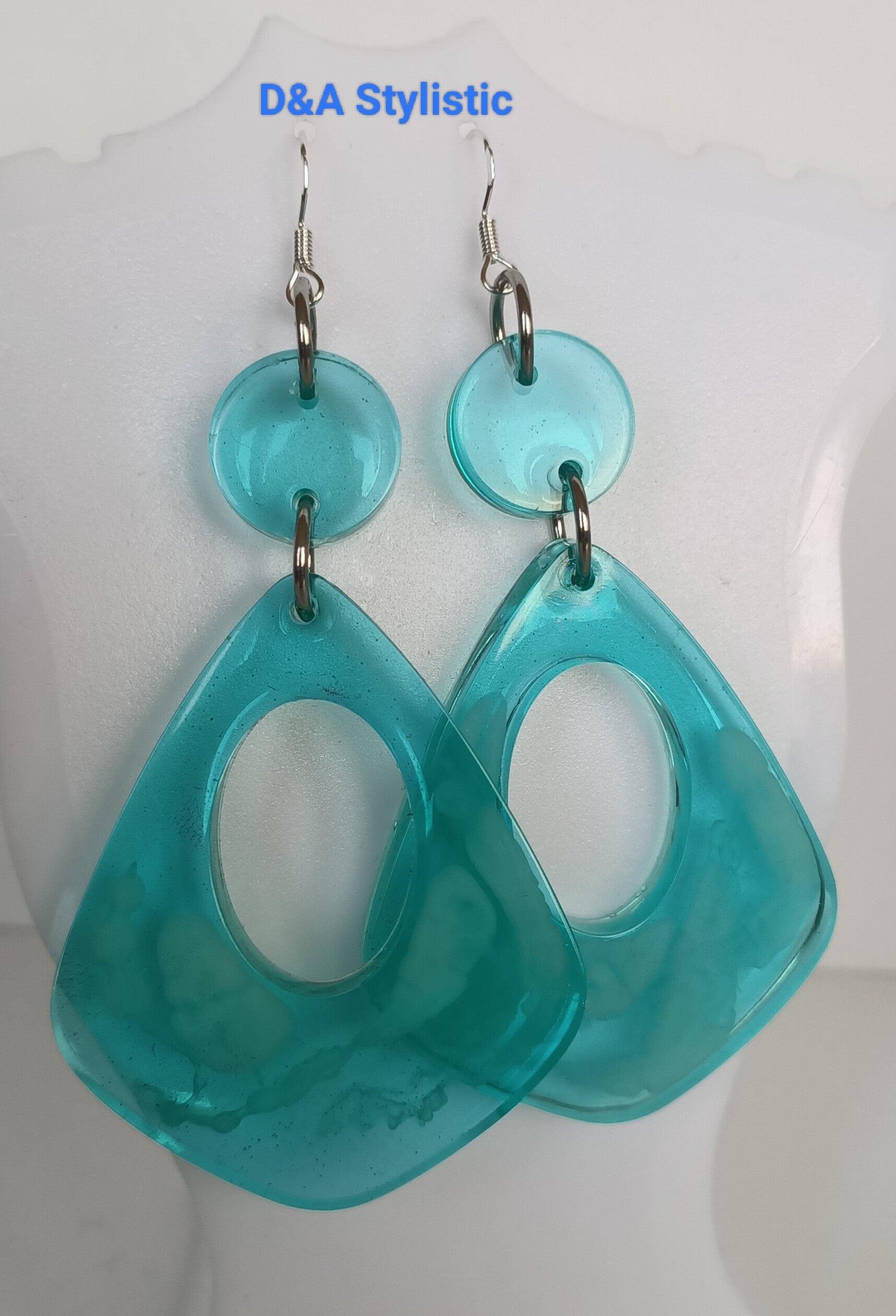 Prachtige oorbellen gemaakt van transparante blauwe kleur met witte druppels gemaakt van epoxy en RVS metalen onderdelen.